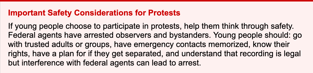 Children Thrive Action Network - “Staying Whole: A Love Letter to Immigrant Parents”: childrenthriveaction.org - A compassionate guide created in partnership with National Parents Union, Little Justice Leaders, and United Parent Leaders Action Network. Shaped by the experiences of families impacted by immigration enforcement, this resource invites parents to reflect on their mental health, guides them through safety planning, and offers guidance on talking to and supporting children. Available in English and Spanish.